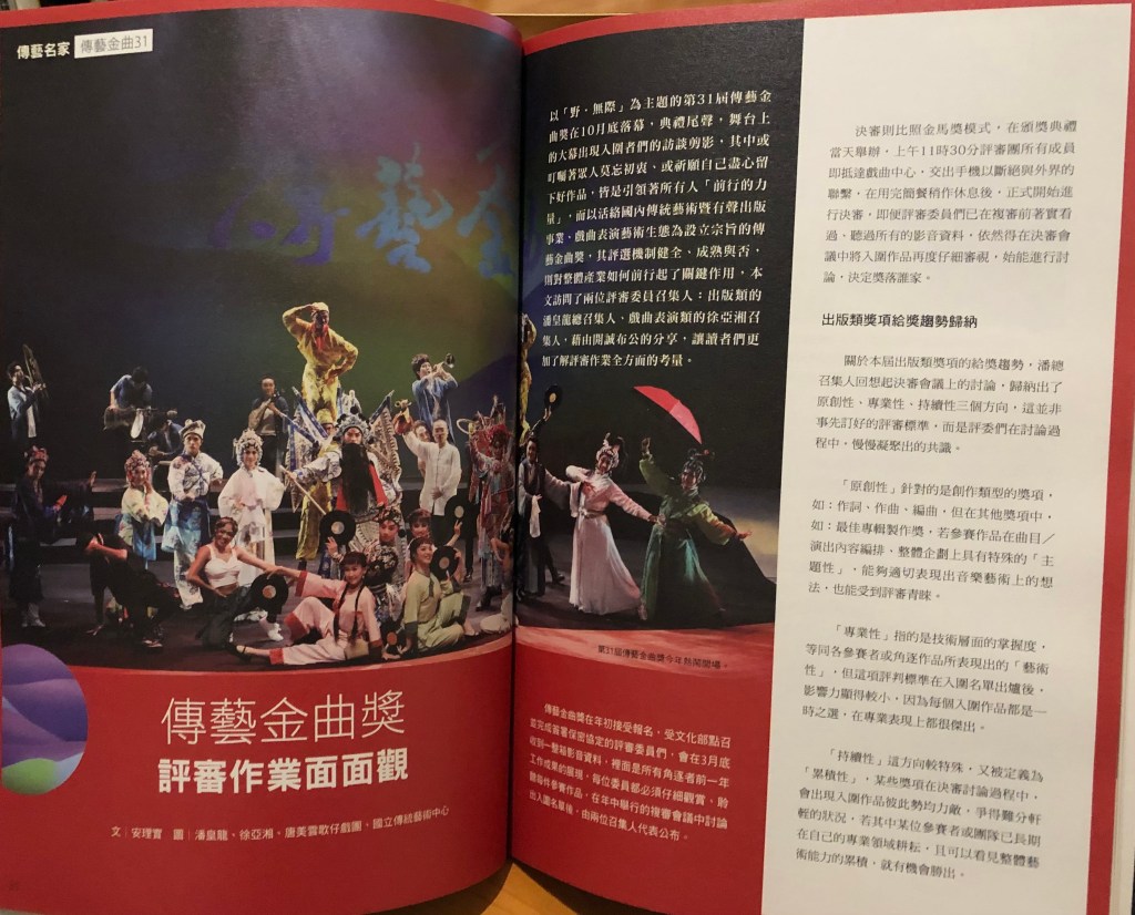 以「野.無際」為主題的第31屆傳藝金曲獎在10月底落幕,典禮尾聲,舞台上的大幕出現入圍者們的訪談剪影,其中或叮囑著眾人莫忘初衷、或祈願自己盡心留下好作品,皆是引領著所有人「前行的力量」,而以活絡國內傳統暨藝術有聲出版事業集戲曲表演藝術生態*為設立宗旨的傳藝金曲獎,其評選機制健全、成熟與否,則對整體產業如何前行起了關鍵作用,本文訪問了兩位評審委員召集人:出版類的潘皇龍總召集人、戲曲表演類的徐亞湘召集人,藉由開誠布公的分享,為讀者們揭開評審作業的神秘面紗。