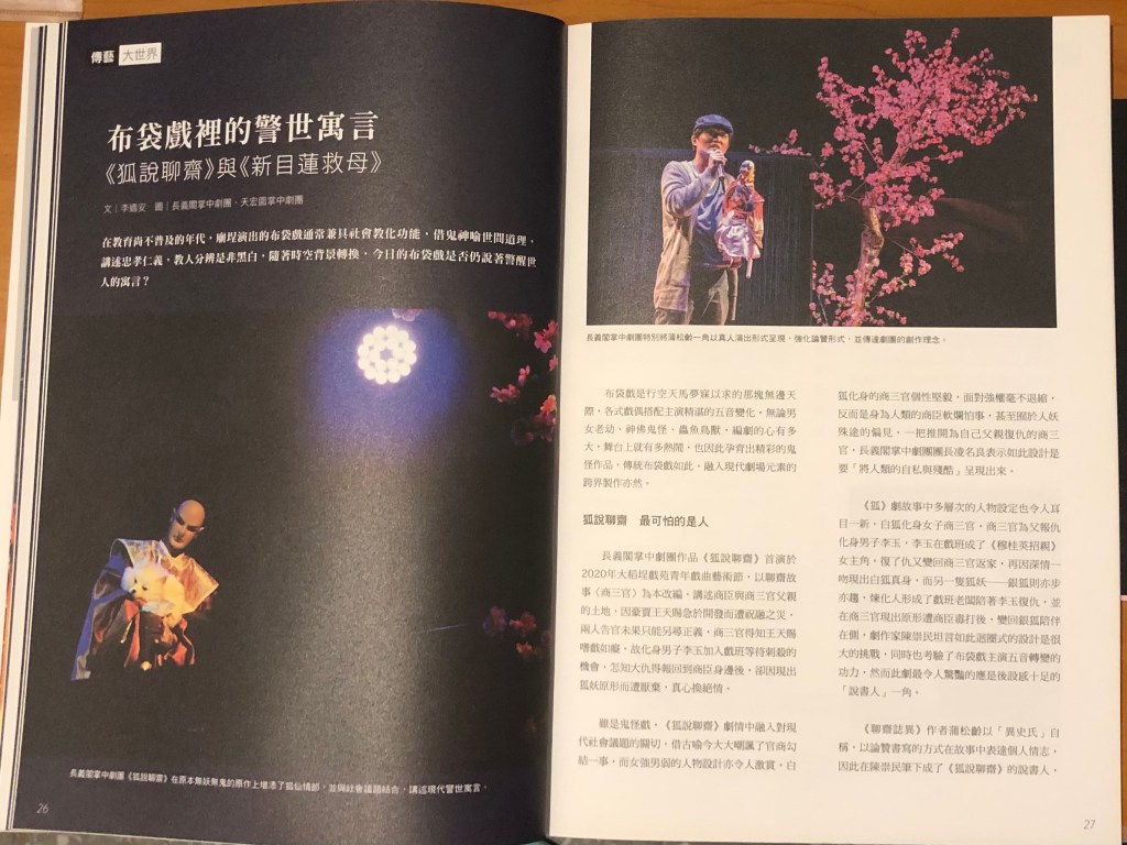 布袋戲是行空天馬夢寐以求的那塊無邊天際,各式戲偶搭配主演精湛的五音變化,無論男女老幼神佛鬼怪蟲魚鳥獸,編劇的心有多大,舞台上就有多熱鬧,也因此孕育出精彩的鬼怪作品,傳統布袋戲如此,融入現代劇場元素的跨界製作亦然。