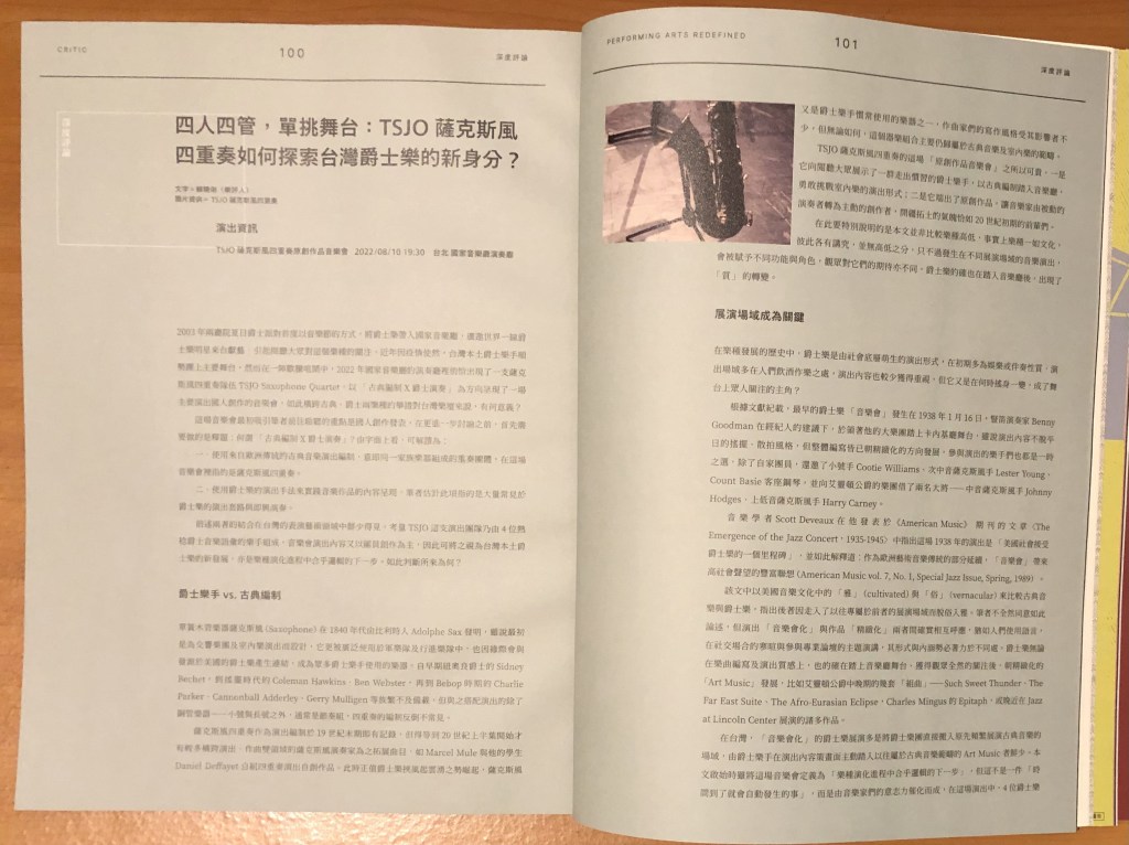 2003年兩廳院夏日爵士派對首度以音樂節的方式將爵士樂帶入國家音樂廳,廣邀世界一線爵士樂明星來臺獻藝,引起閱聽大眾對這個樂種的關注,近年因疫情使然,臺灣本土爵士樂手順勢躍上主要舞台,然而在一陣歡騰喧鬧中,2022年國家音樂廳的演奏廳裡悄悄出現了一支薩克斯風四重奏隊伍TSJO Saxophone Quartet,以「古典編制x爵士演奏」為方向呈現了一場主要演出國人創作的音樂會,如此橫跨古典、爵士兩樂種的舉措對台灣樂壇來說,有何意義?