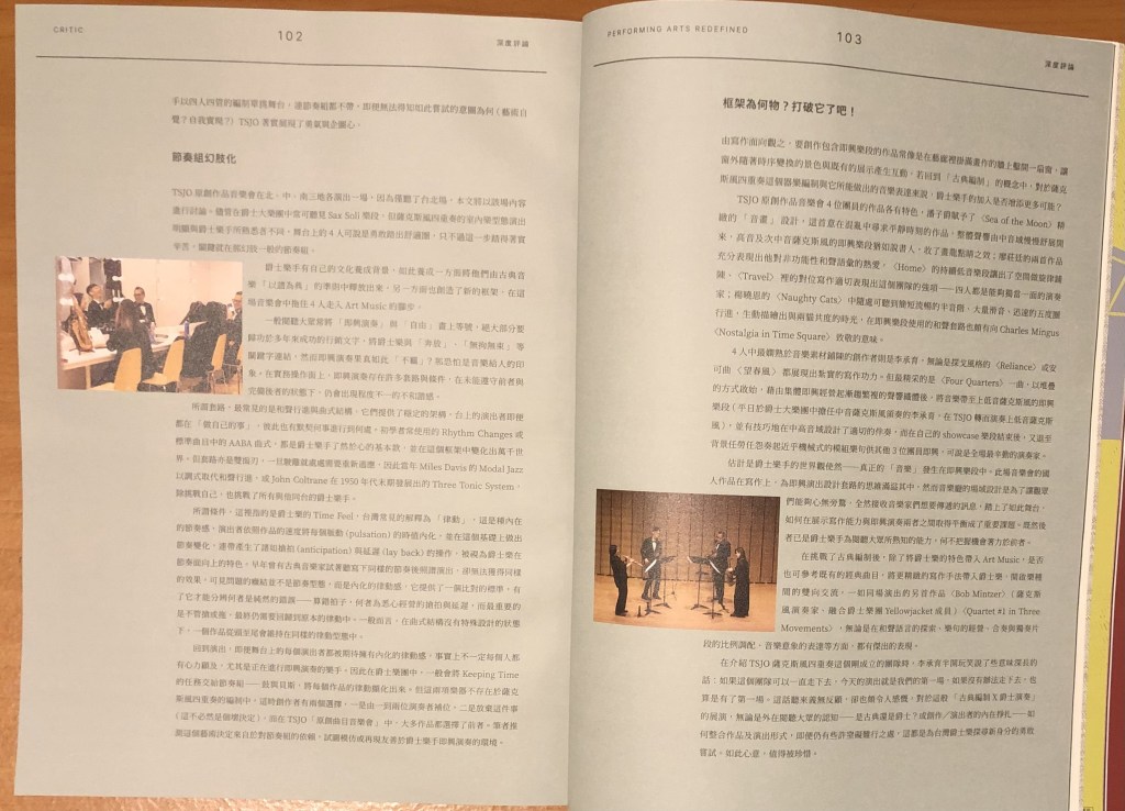 這話聽來義無反顧,卻也頗令人感慨,對於這般「古典編制x爵士演奏」的展演,無論是外在閱聽大眾的認知—是古典還是爵士?或創作/演出者的內在掙扎—如何整合作品及演出形式,即便仍有些許窒礙難行之處,這都是為臺灣爵士樂探尋新身分的勇敢嘗試,如此心意,值得被珍惜。