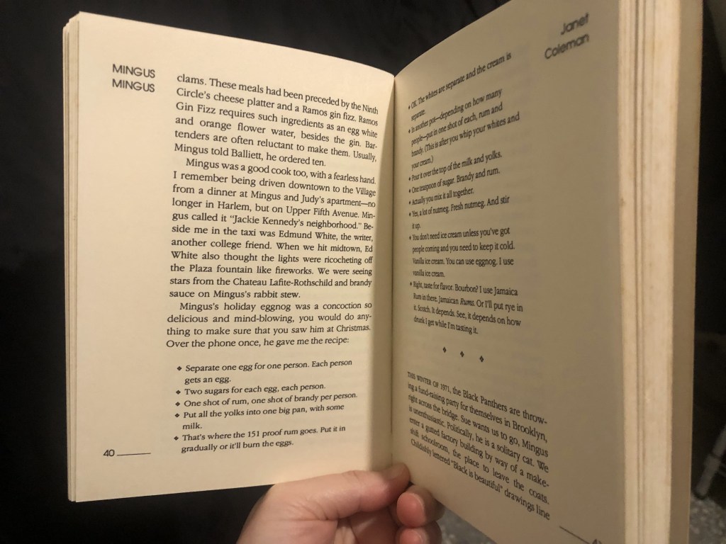 Mingus’s holiday eggnog was a concoction so delicious and mind-blowing, you would do anything to make sure that you saw him at Christmas. Over the phone once, he gave me the recipe: 明格斯在假期時調的蛋奶酒美味到令人難以置信,讓人不計一切想在聖誕節期間碰上他。有一次在電話裡,他給了我食譜:
