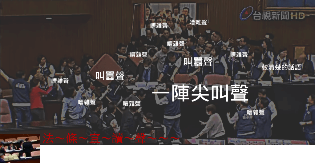 在這50秒的國會聲景裡,有眾人的嘈雜聲,有較大聲的叫囂,還有一些因為說話者很靠近立法院長麥克風的清楚言語,另外還有一陣尖叫聲,那是第一位被推下主席台的立委所引起的聲音,隨即聽到眾人大喊的「一、二、三」則是在野黨立委在將另一人推下主席台的協力聲,然而在這些推擠衝突與暴力事件發生的時候,全程,法條宣讀的聲音都沒有停止。