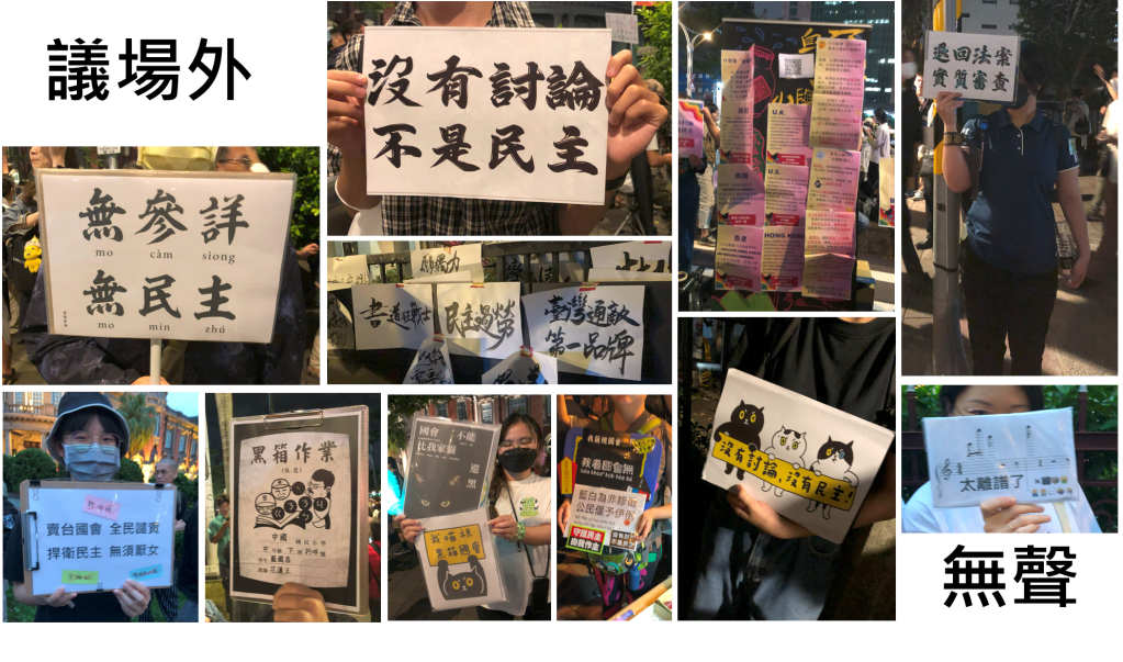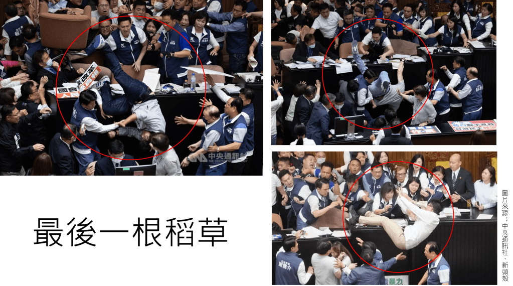 臺灣的國會衝撞有其歷史脈絡,最近一次發生在2020年底,在野黨因反對進口含萊克多巴胺的美國豬肉,在行政首長發表施政報告時開啟了豬內臟投擲攻擊,[10] 輔以空氣喇叭及哨子的聲音攻擊癱瘓議事。雖說國會殿堂成為菜市場的景象歷歷在目,在人民的認知中,如此狂亂無序的行為仍被視為議事攻防手段,國會生態的一部分,直到2024年5月17日發生了罔顧人命的暴力事件,民眾頓時意識到代議民主失靈,國會運作功能被破壞,自己賦予民意代表的聲音已被剝奪,因此再度啟動參與民主的手段,站上街頭發出自己的聲音。