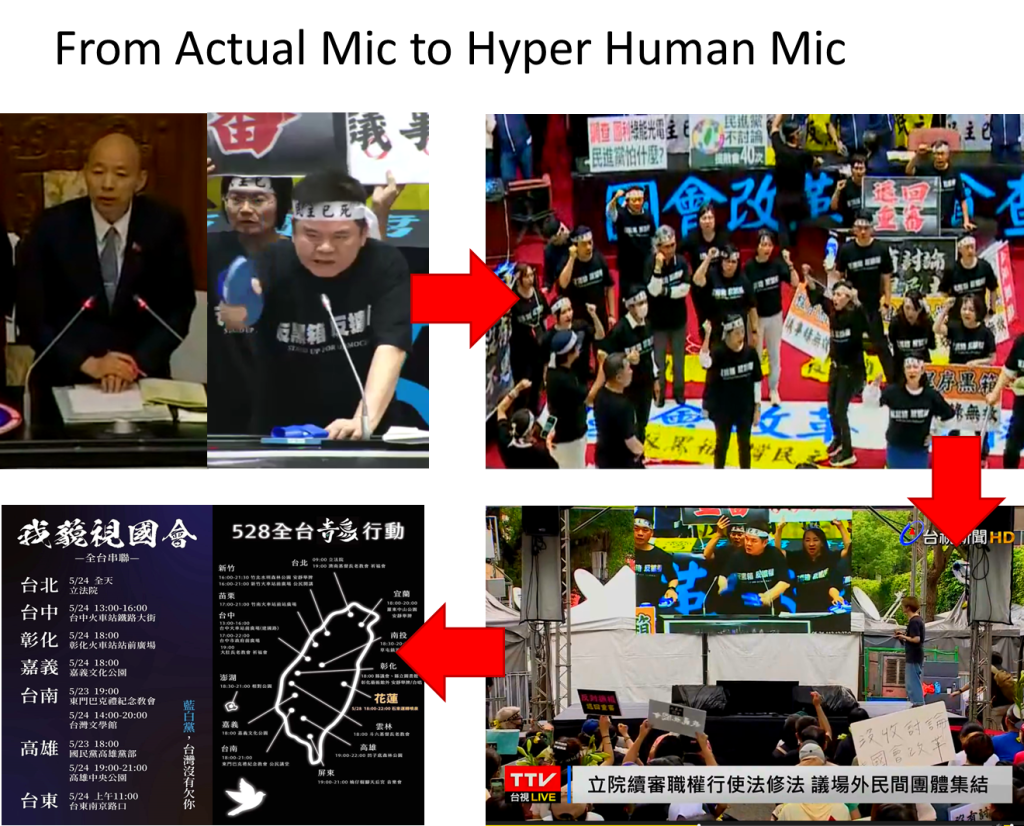 這時國會頻道及駐點在議場內的電子媒體成為關鍵,當它們透過同步轉播將議場內的狀況傳達到議場外,無論是守在青島東路、濟南路上觀看著大投影布幕的青鳥行動參與者,或是透過電腦、手機、平板…等載體實時收看議事過程的民眾,頓時都成為潛在的人體麥克風,比如5月24日晚間在青島東路支持者,看著投影在主舞台布幕上的王世堅立委演講,除了歡呼與鼓掌,更是隨著議場內的委員們呼起「反黑箱,反擴權」口號,而5月28日早上范 雲立委的演講,也讓冒雨守在濟南路舞台前的支持者們,化身為超人體麥克風,若再考量青鳥行動在524、528院會都出現遍地開花的狀況,意即在臺北市之外的部分縣市也發展出群眾聚集聲援的行動,[15] 如果那些集會中也使用了同步轉播的操作,這支超人體麥克風的「擴音」範圍,是否又被延伸得更廣?