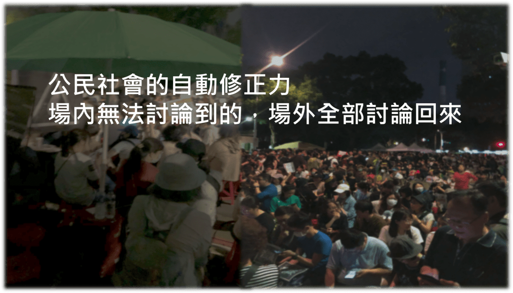 這是觸發民眾開始在立法院側門口集結的關鍵事件,在那之前,人民對於臺灣國會議事攻防吵吵鬧鬧的「民主聲景」可說是見怪不怪,但當晚發生惡意暴力事件同時,有一個令人難以忽視的聲音。