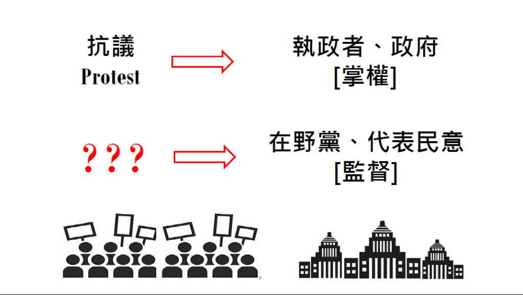 再進一步探討群呼口號的溝通對象,同樣的行為在議場內外是否有「目的」及「方向」的差異?對場內黨團來說,此舉的目的可視為物理性質的擴大音量,將自己的論述「向外」傳得更遠,溝通對象是議場內其他人、駐場媒體、場外民眾、收看國會頻道的觀眾,但對場外民眾而言,尤其是守在青島東路、濟南路上的支持者,呼口號的意圖應有些許不同,畢竟所有的論述已透過各式媒體觸及閱聽大眾,場外呼喊的口號即使依然具有擴大音量的功能,其目的應是對該論述的再確認,傳遞的方向與其說是向外,更有可能意圖「向內」將聲音送回議場內,應援自己支持的代議士們。