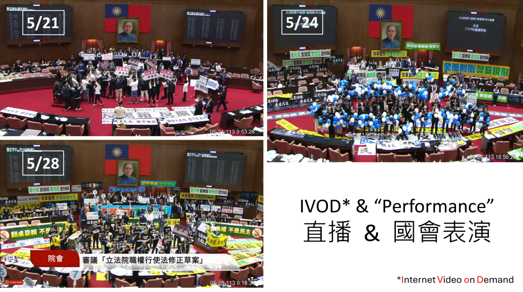 若以Erving Goffmann的參與框架 (participation framework) 概念來解釋,代議士乘載人民的意志在國會內發出人民的「聲音」,她/他溝通的對象是乘載其他民意的代議士,意即在正常狀況下,不同黨團的代議士們是彼此「聲音」的主要接受者 (the addressees),觀看議事動態的民眾則否,然而在521、524、528院會中的國會表演有了不一樣的溝通對象,代表人民發聲者轉向與人民直接對話,其中有將「聲音」託付給自己的人民,也有將之託付給對手陣營者,筆者思索,兩個陣營的代議士由彼此對話轉為爭相對著鏡頭表演,這應是隨著議事轉播IVOD建置而出現的行為,如此形式的表演在青鳥行動中,也藉由實時轉播的操作衍生出超人體麥克風現象。