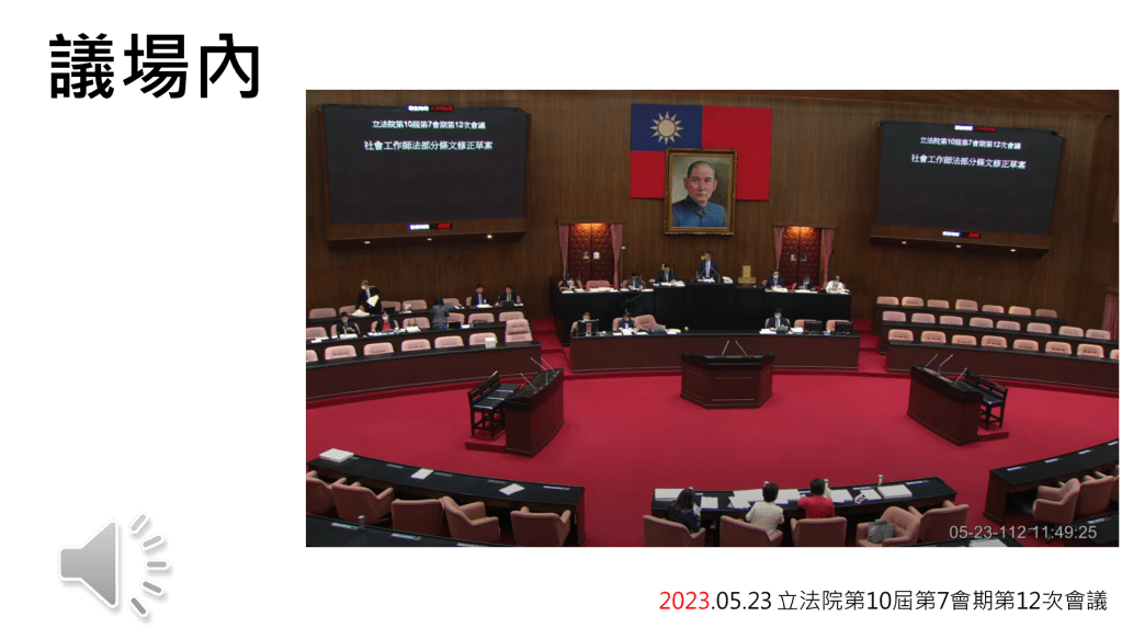 首先是去年同時期的立法院二讀會第10屆第7會期第12次會議,這裡有立法院的議事工作人員宣讀法條,還有當時的立法院副院長蔡其昌宣讀該法條「在審查會裡」的討論結果,這是委員會中心主義的特色,該討論的各項事宜在二讀會前完成,正常狀況下,若沒有任何人提出文字修正的需求,法條會直接進入三讀,新的法律就這麼產生了,因此這可說是立法院議事制度「正常運作」時的聲音,接下來再進到另一個議場,今年5月17日的立法院二讀會,當晚7時零38秒起的50秒時間內,議場內發生了什麼事?
